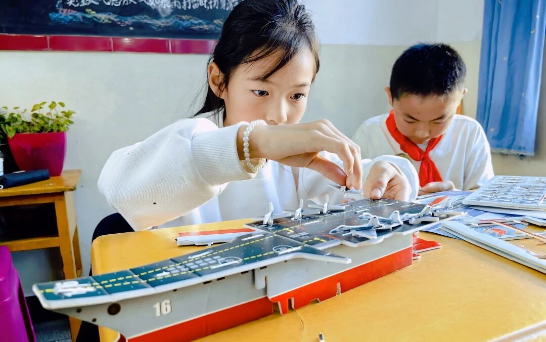課堂特別設(shè)計(jì)趣味問(wèn)答與互動(dòng)實(shí)踐環(huán)節(jié)。問(wèn)答環(huán)節(jié),學(xué)生們踴躍舉手搶答、主動(dòng)提問(wèn);船模組裝實(shí)踐環(huán)節(jié),志愿者手把手指導(dǎo)學(xué)生對(duì)照?qǐng)D紙拼接零件,當(dāng)一個(gè)個(gè)船模成型時(shí),孩子們臉上滿是收獲的喜悅,不僅直觀掌握船舶構(gòu)造原理,更在動(dòng)手過(guò)程中筑牢國(guó)防意識(shí)。此次志愿服務(wù)播下的“深藍(lán)種子”,或許將在未來(lái)生根發(fā)芽一一有人可能成為海軍戰(zhàn)士、有人或許成為工程師……我們志愿路,也將沿著瀾滄江脈絡(luò),延伸向更遠(yuǎn)的遠(yuǎn)方。