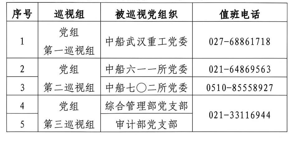按照中國船舶集團有限公司黨組對巡視工作統一部署,近日,2026年度第一批次巡視組完成全面進駐。此批巡視分3個巡視組,分別對中船武漢重工黨委、中船六一一所黨委、中船七〇二所黨委等黨組織開展常規巡視,對總部綜合管理部黨支部、審計部黨支部開展“四型”總部建設專項巡視。