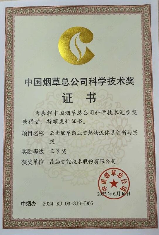 近日,中船集團旗下昆船公司所屬昆船智能協(xié)同相關(guān)單位及高校申報的“云南煙草商業(yè)智慧物流體系創(chuàng)新與實踐”項目成果獲得中國煙草總公司科技進步獎三等獎。