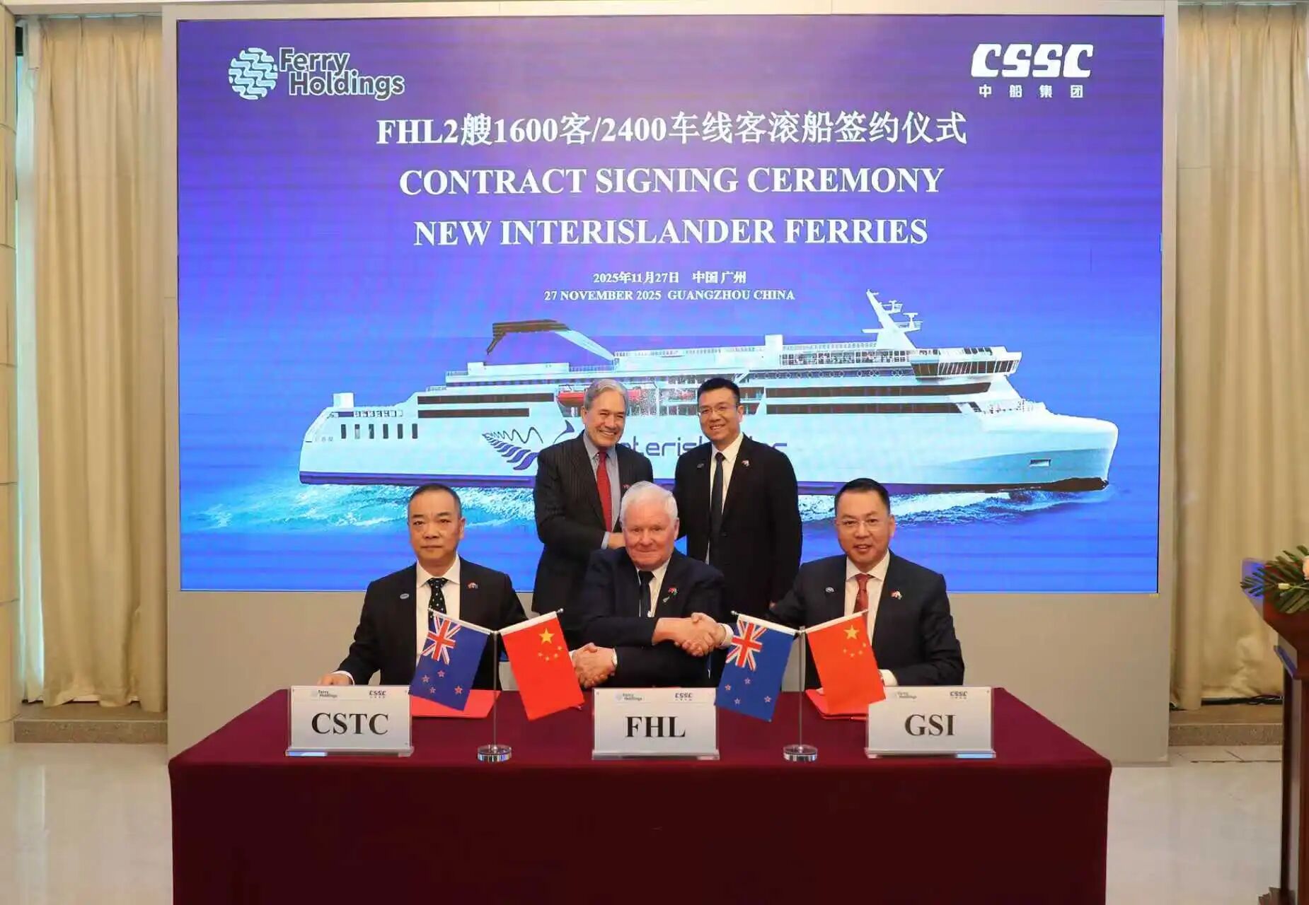 11月27日,中國(guó)船舶集團(tuán)有限公司旗下廣船國(guó)際有限公司攜手新西蘭FHL(Ferry Holdings)公司簽署2艘新型客滾船建造合同。當(dāng)天簽約的客滾船項(xiàng)目,是連接中新兩國(guó)友誼的重要紐帶。在中船集團(tuán)與FHL公司攜手推動(dòng)下,雙方共贏合作邁出了關(guān)鍵一步。
